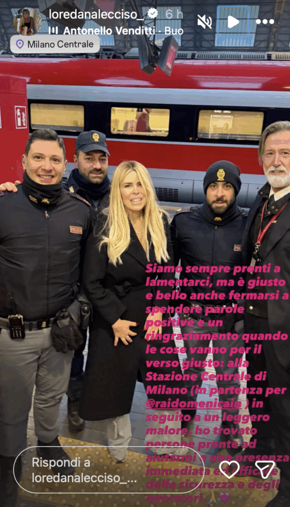 “Siamo sempre pronti a lamentarci, ma è giusto e bello anche fermarsi a spendere parole positive – ha scritto su Instagram – e un ringraziamento quando le cose van per il verso giusto: alla Stazione Centrale di Milano, in partenza per Domenica In, in seguito a un leggero malore, ho trovate persone pronte ad aiutarmi e una presenza immediata ed efficace della sicurezza e degli operatori”.