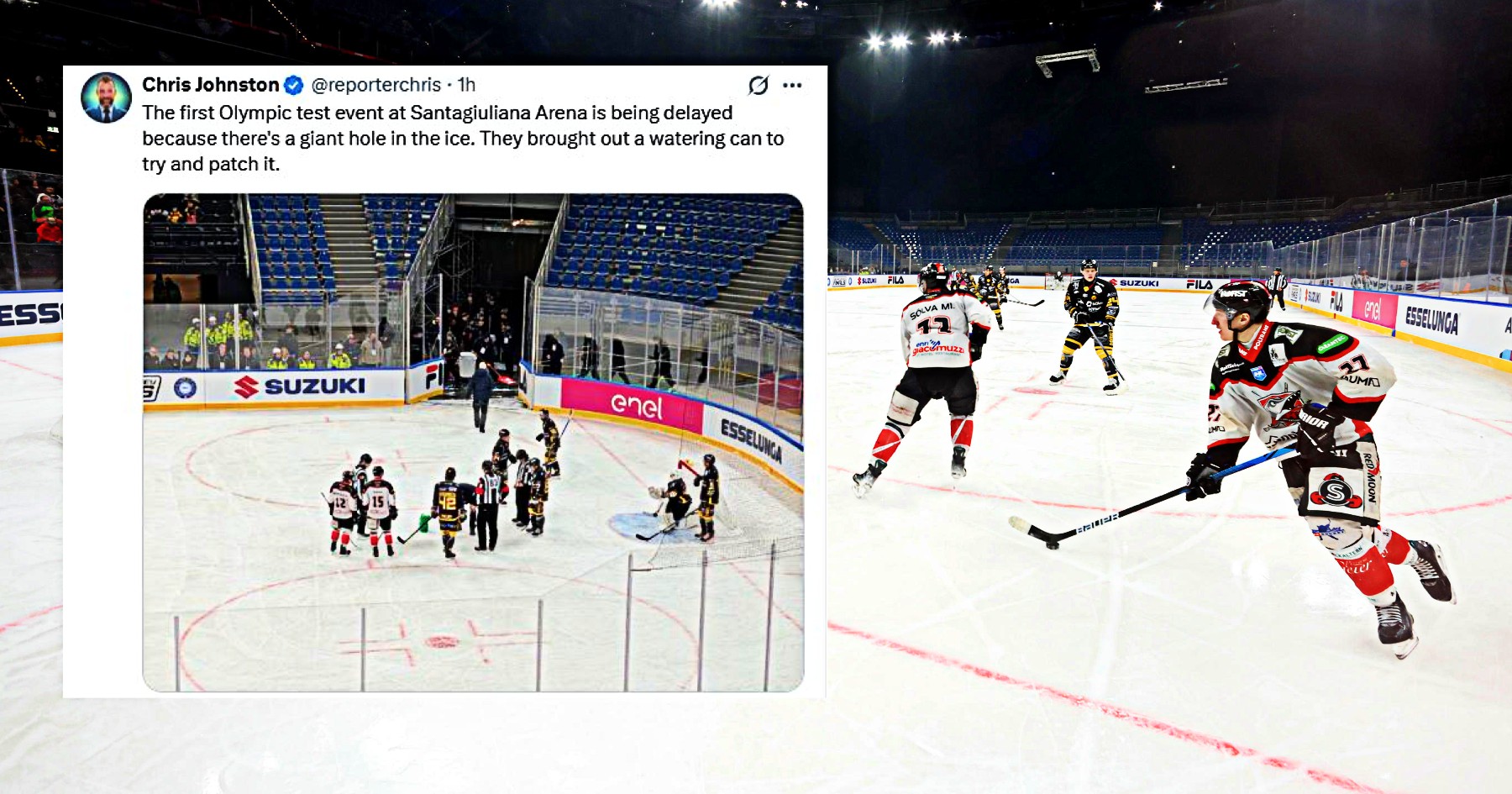Mentre il palazzetto è ancora un cantiere aperto, anche il ghiaccio crea un intoppo: il primo test dell’hockey all’Arena Santa Giulia doveva dimostrare che il nuovo impianto è pronto per le Olimpiadi, che cominceranno tra meno di un mese. Invece già nel primo match delle Milano Hockey Finals, la semifinale di Coppa Italia tra Varese e Caldaro, è emerso un problema. Nelle specifico, la partita è stata interrotta per diverso tempo- circa 5 minuti – a causa di un piccolo buco nel ghiaccio. Per risolvere la situazione si è dovuto ricorrere anche a un annaffiatoio.