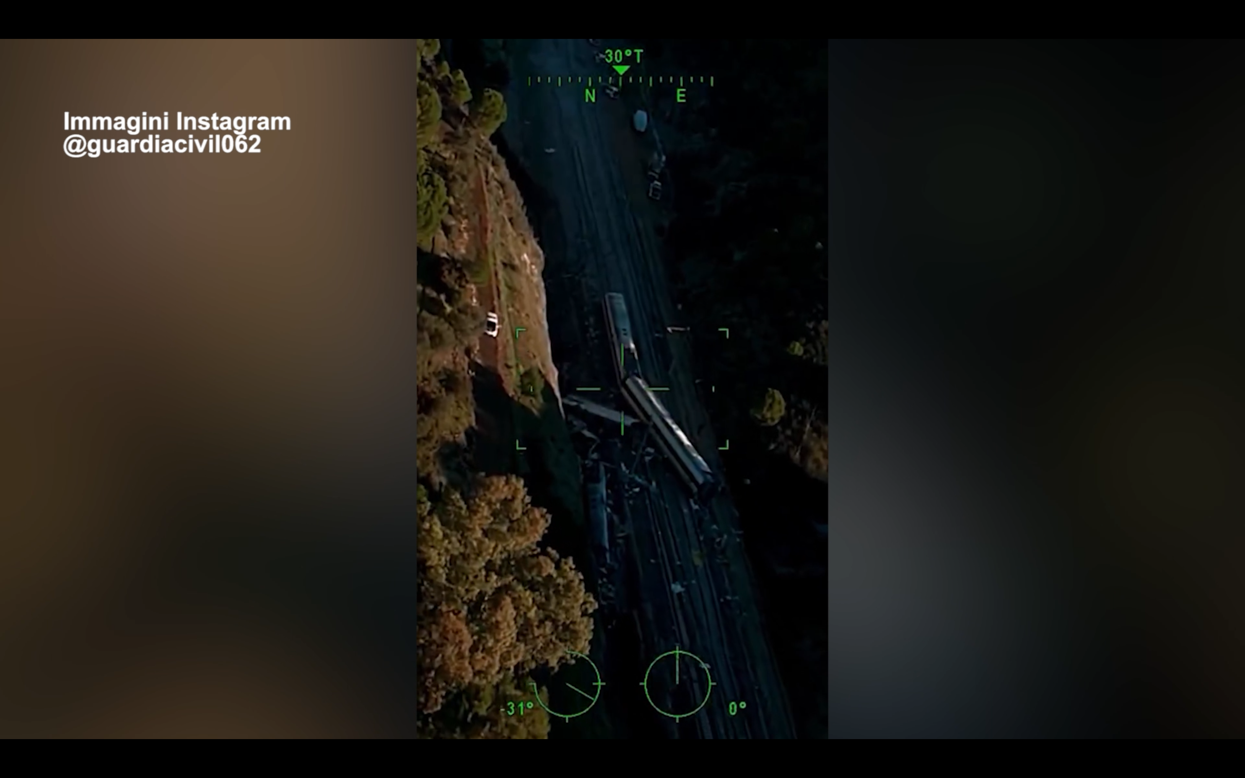 Le immagini dall’alto mostrano il disastro provocato dal deragliamento di due treni sulla linea dell’alta velocità Madrid-Andalusia, che ha provocato decine di vittime e centinaia di feriti. La tragedia è avvenuta all’altezza di Adamuz (Cordova). Nel video si vedono le squadre di emergenza e una quarantina di militari dell’Unità di protezione civile dell’Esercito mentre lavorano per estrarre i superstiti dalle lamiere.