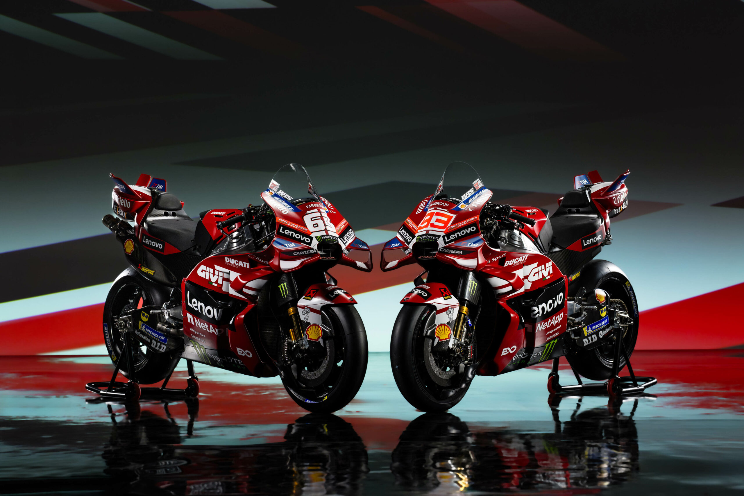 A guidarla ci saranno anche il campione del Mondo Marc Márquez e Francesco Pecco Bagnaia, in cerca di riscatto dopo una stagione deludente. L’altra particolarità sarà il rosso scuro, come quello delle origini: dal rosso della Ducati 60 del 1949, prima moto completa che segnò l’esordio della Ducati tra i costruttori motociclistici, a quello della Gran Sport “Marianna” del 1955, la prima Ducati concepita per correre. Particolarità anche sui numeri: Marquez manterrà il 93 (come sempre ha rinunciato al numero 1) di colore rosso, mentre Bagnaia – non solo avrà un font diverso dal compagno – ma avrà il suo 63 in bianco.