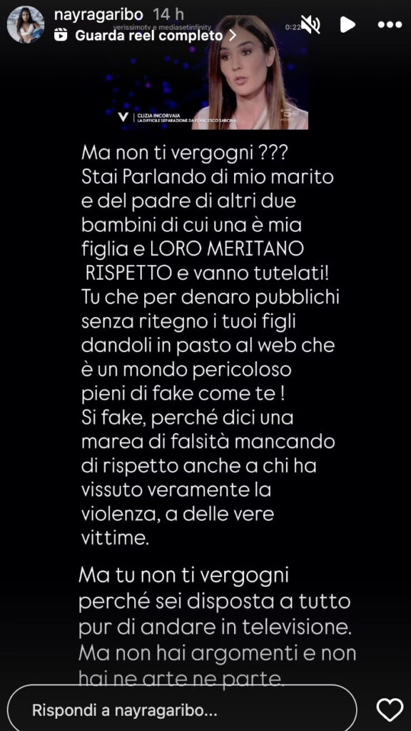 Non sono affatto piaciute alla moglie di Francesco Sarcina, Nayra Garibo, le parole di Clizia Incorvaia che è intervenuta a “Verissimo” dopo essere stata prosciolta dalle accuse dell’ex marito, che l’aveva denunciata, accusandola di aver pubblicato sui social immagini della loro figlia minore per “trarne un profitto economico”.