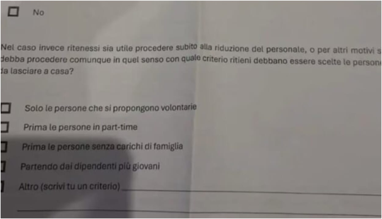 “Chi vorresti lasciare a casa?”. Questa una delle domande del questionario distribuito ai lavoratori della Bluergo di Castelfranco Veneto, in provincia di Treviso, alla vigilia di Natale. L’azienda – che produce componenti elettrici – ha una sessantina di addetti. Tra le domande, una chiede di indicare criteri per esclusioni “eventuali“. Recita così: “Nel caso ritenessi utile procedere subito alla riduzione del personale, o per altri motivi si debba comunque procedere in quel senso, con quali criteri ritieni debbano essere scelte le persone da lasciare a casa?”. Per decidere chi licenziare si sceglie tra cinque opzioni. I criteri sono: persone che si propongono volontarie; prima i part–time; le persone senza carichi familiari; i più giovani; altro (da specificare).