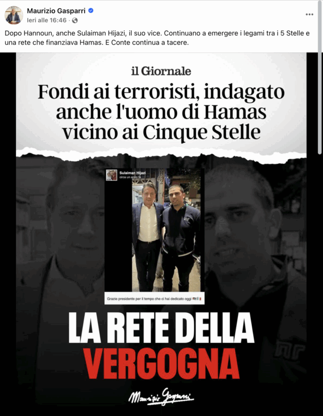Ed eccoli lì, sprezzanti d’ogni pericolo. Matteo Salvini e Maurizio Gasparri sorridenti accanto al “pericoloso” Sulaiman Hijazi, l’attivista palestinese finito nell’inchiesta della Procura di Genova sui fondi di Hannoun e da mesi usato da giornali e politici di destra come clava per accreditare l’affiliazione degli avversari a una presunta “rete islamista” a sostegno di Hamas. Una campagna denigratoria senza sosta: ancora oggi Il Giornale regala nuove perle, con l’ennesimo affondo contro “Giuseppe Conte l’islamista”. Che puntualmente Gasparri ha rilanciato sui suoi social, come si vede dall’immagine successiva.