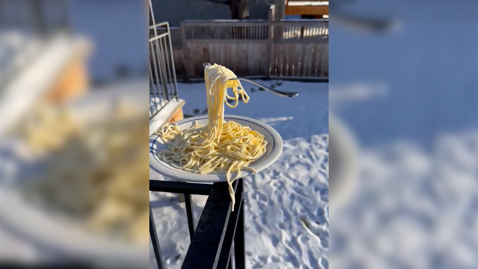 Nella breve clip la meteorologa appoggia un piatto di spaghetti sul balcone e li arrotola con una forchetta. Dopo essere rimasta, con ogni probabilità, qualche minuto con la forchetta sospesa in aria, il risultato è strabiliante: la pasta è congelata, così come la forchetta, e il tutto resta sospeso nell’aria come per magia.