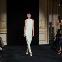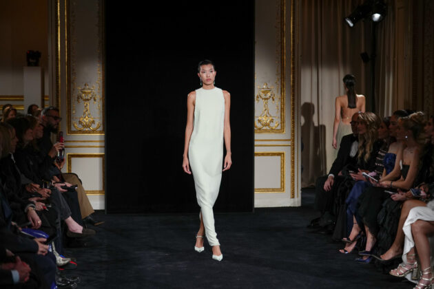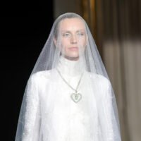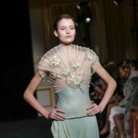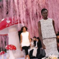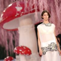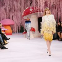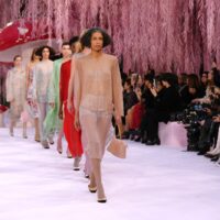 Dalla misura silenziosa di Armani si passa al bosco incantato del Grand Palais, dove Chanel pianta funghi monumentali e salici rosa. Ma il vero incantesimo, come Mathieu Blazy chiarisce subito, non è il set. È il lavoro. “L’alta moda è la vera anima di Chanel”, dichiara. E lo dimostra spogliando la maison dei suoi emblemi più ovvi per riportarla a un punto zero: l’essenza della donna Chanel. Letteralmente. Il tailleur d’apertura non recita il tweed, lo distilla. Mousseline di seta, trasparenze, organze assemblate con taglio chirurgico. La storica catena resta cucita nell’orlo: peso segreto, memoria funzionale. La collezione è un esercizio magistrale di alleggerimento. Piumaggi evocati senza piume, volumi costruiti con plissé, ricami, intrecci. Il dialogo tra flou e tailoring diventa una coreografia di mani, con i savoir-faire dei laboratori le19M a tenere tutto insieme. Oggetti intimi – una lettera, una boccetta di N°5, un rossetto – diventano tessuto, gioiello, dettaglio interno che si fa esterno. Anche l’iconica borsa si svuota e si fa trasparente e inconsistente. Blazy cita un haiku giapponese: “Uccello sul fungo / la bellezza mi colpisce / e già se ne va”. La bellezza come attimo, come fragilità. E infatti qui tutto sembra sospeso, etereo: anche quando appaiono canotta e jeans (in realtà tutti fatti di mousseline), la favola resta concreta.