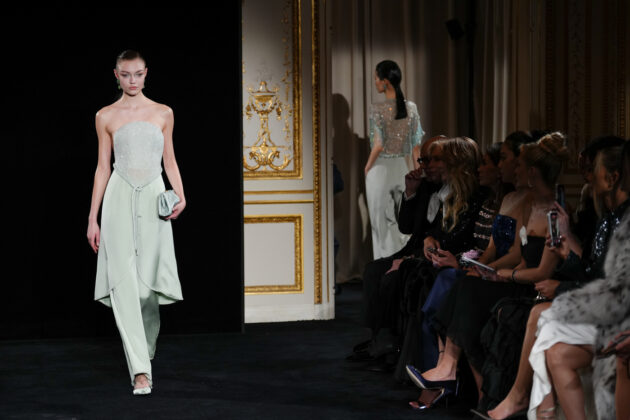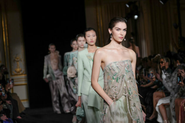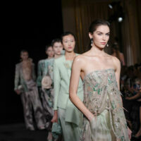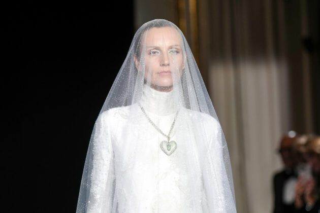 Il verde giada attraversa la palette come un filo simbolico – armonia, equilibrio, valore che non ha prezzo – insieme a rosa polverosi, bianchi lattiginosi, neri grafici. L’Oriente, da sempre parte del vocabolario Armani, non diventa scenografia ma eco: micro-ricami di lanterne, ventagli suggeriti, cravatte in organza che alleggeriscono il tailoring. Quando arrivano cristalli e ricami, non irrigidiscono mai la superficie. Si posano, ondeggiano, danzano con il corpo. Restano tattili. C’è continuità, certo. Ma c’è anche uno sguardo diverso. Se Giorgio Armani tendeva all’archetipo, Silvana guarda al corpo reale, al gesto quotidiano, al comfort come forma di lusso. È una couture che non chiede distanza per essere credibile. E proprio per questo convince. È qui che l’eredità smette di essere peso e diventa strumento. E alla fine la sfilata si chiude con un colpo di teatro: in passerella esce Agnese, la modella prediletta dal signor Armani, con indosso un abito da sposa, una delle ultime creazioni disegnate dallo stilista piacentino: Silvana l’ha realizzato e l’ha messo in chiusura, riprendendo una tradizione della couture che qui mancava da tempo.