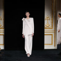 La sfilata Giorgio Armani Privé primavera-estate 2026 si apre con un gesto che vale più di mille dichiarazioni: un tailleur pantalone. Niente abito da sera, niente rituale da gran soirée. La couture entra subito nel tempo del giorno, nello spazio dell’uso. È una scelta programmatica, prima ancora che di stile. Qui si capisce tutto. Silvana Armani debutta alla guida di Privé dopo quarantacinque anni di lavoro accanto allo zio e lo fa in punta di piedi, ma il suo tocco c’è e si vede, proprio come è stato nei giorni scorsi per Leo Dell’Orco con l’Uomo. Non porta una rivoluzione rumorosa, ma un riequilibrio profondo. La sua è una couture pensata da una donna per le donne, con la consapevolezza di chi quegli abiti li ha indossati davvero. Non c’è desiderio di costringere il corpo, ma di accompagnarlo. La bellezza non è più sacrificio, non è un’ideale assoluto. È portabilità, movimento, durata. I pantaloni tornano e ritornano, studiati al dettaglio con pence sartoriali che donano morbidezza senza “sporcare” la silhouette, tradotti in chiffon, organza, cady. Le giacche si svuotano di struttura senza perdere autorevolezza e si fanno sempre più blusa, maglia. I bustini sono in seta impalpabile e dialogano con tagli maschili, le tuniche si aprono rivelando linee precise, gli abiti a colonna si muovono grazie a drappeggi intelligenti. È una couture chiara, fluida, pulita e luminosa: “A Giorgio sarebbe piaciuta”, dice Silvana Armani nel backstage con un sorriso di soddisfazione.