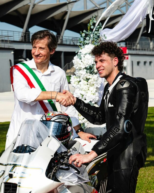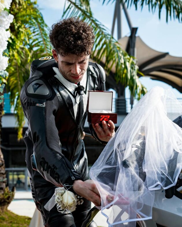 “Lei, signor Marco Bezzecchi, intende prendere in moglie la qui presente RS-GP Albarosa?”. No, non stiamo inventando nulla: il rinnovo di Marco Bezzecchi con l’Aprilia è andato esattamente così. Perché la permanenza in Aprilia del pilota italiano era praticamente scontata, l’annuncio lo è stato meno. Anzi, è stato un annuncio che definire singolare è poco. Dopo la gag realizzata dallo stesso Bezzecchi nell’ultima vittoria dello scorso anno a Valencia, quando ‘chiese in sposa’ la sua RS-GP (presentata qualche settimana fa) con tanto di anello, ecco che Albarosa – così il pilota ha ribattezzato la sua moto – e Bezzecchi hanno celebrato davvero il matrimonio a Sepang, in Malesia.