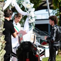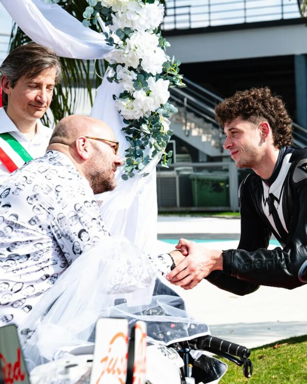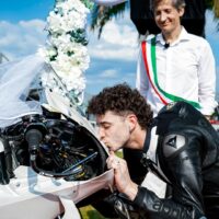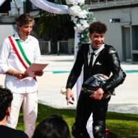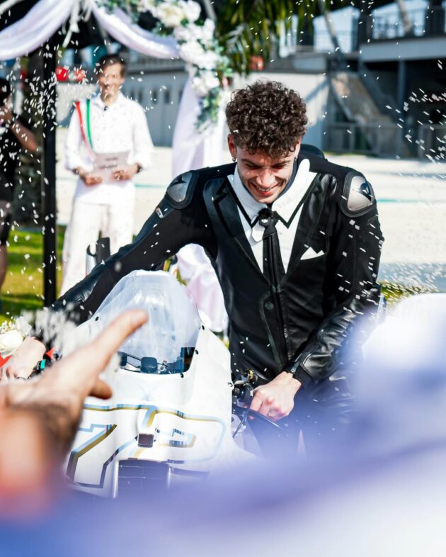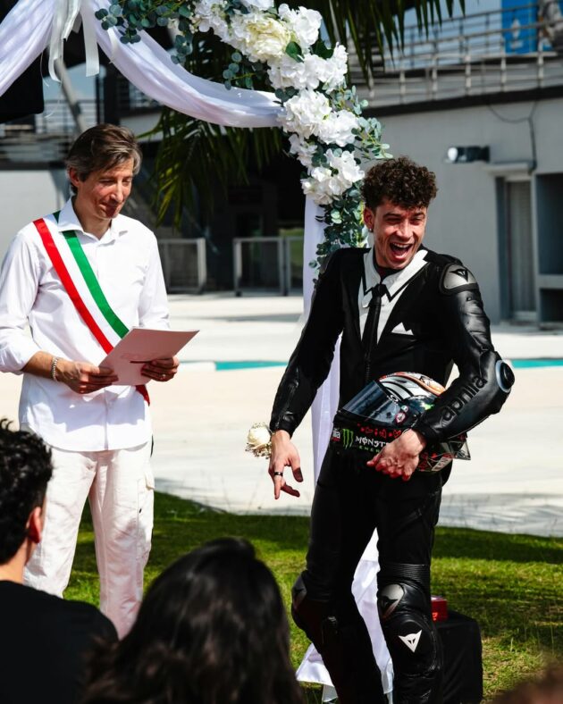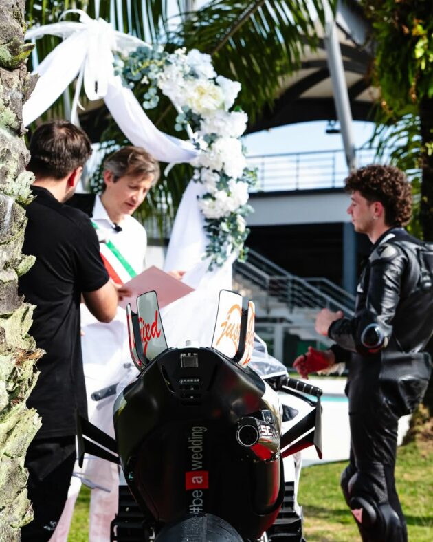 Bezzecchi rimarrà in Aprilia fino al 2027, ma a prendersi la scena è stato senza dubbio il video pubblicato sulla pagina ufficiale dell’Aprilia nella mattinata del 2 febbraio. Una gag curata nei minimi dettagli: Bezzecchi con una tuta–smoking invidiabile, la nuova moto bianca per l’occasione, con il velo e un “abito da sposa”, gli invitati in lacrime a seguire la celebrazione, una violinista a riprodurre le tipiche colonne sonore del matrimonio, tra cui la marcia nuziale. Il riso all’uscita degli sposi sulla passerella, lo scambio di anelli, il bacio dopo il matrimonio, il sì a voce di Bezzecchi e il sì con un rombo di motore dell’Aprilia. Tutto come da copione, ina una cornice suggestiva e iconica: il paddock di Sepang. Con un officiante d’eccezione: l’amministratore delegato di Aprilia, Massimo Rivola, con la fascia tricolore.
