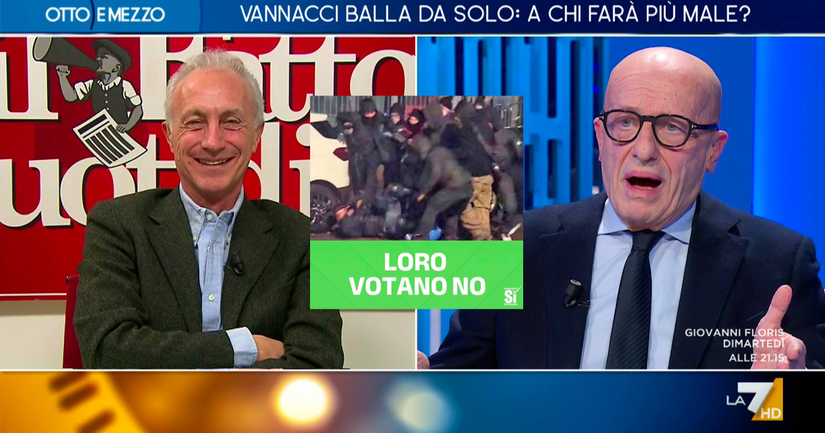A sollevare il caso è la conduttrice Lilli Gruber, che chiede conto a Sallusti della card diffusa sui social dal Comitato “Sì Riforma”, nella quale compare l’immagine dell’aggressione al poliziotto durante gli scontri di Torino del 31 gennaio 2026, accompagnata dalla scritta “Loro votano no”.