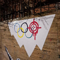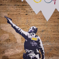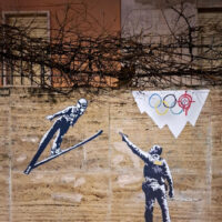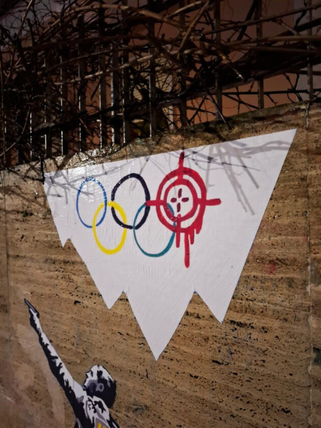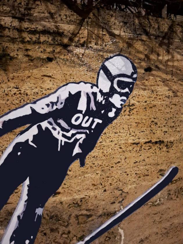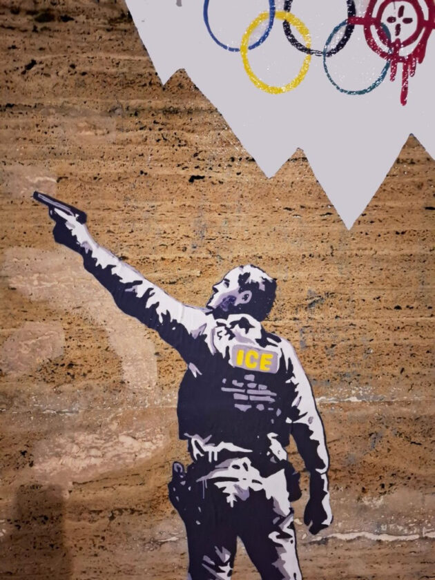 Stavolta l’artista ha lasciato le sue tracce davanti alla sede del CONI in viale Tiziano: l’opera ritrae un agente dell’ICE che spara a uno ski jumper e una montagna rovesciata con il logo dei Giochi Olimpici, in cui il cerchio rosso si trasforma in un mirino. Il titolo dell’opera, come anche la scena rappresentata, è piuttosto esplicativo: “ICE OUT!“.