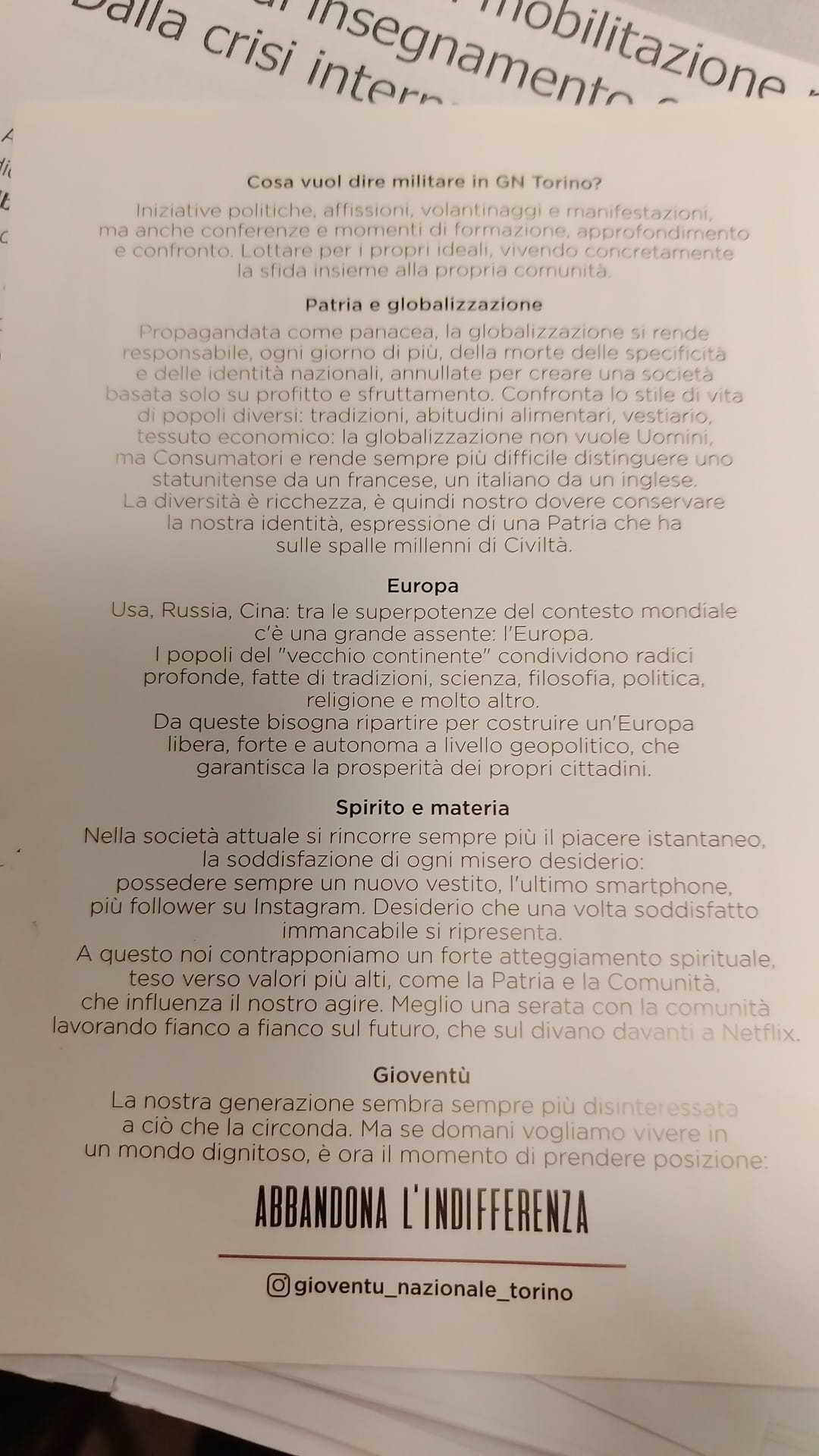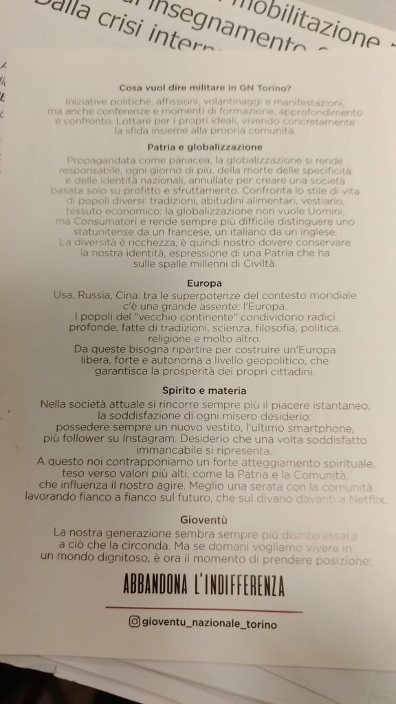 “La nostra generazione sembra sempre più disinteressata a ciò che la circonda. Ma se domani vogliamo vivere in un Mondo dignitoso, è ora il momento di prendere posizione. Abbandona l’indifferenza”. Così si conclude il volantino che i militanti di Gioventù Nazionale stanno distribuendo in questi giorni davanti alle scuole (questo in particolare davanti al Copernico di Torino). Io con giovani che adoperano parole del genere ci vorrei parlare.