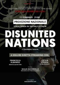 Un evento speciale con oltre 100 sale coinvolte, da nord a sud. Mercoledì 11 febbraio, alle ore 21, il documentario Disunited Nations del regista francese Christophe Cotteret sarà trasmesso all’Anteo City Life di Milano e in contemporanea in altre decine di cinema italiani che hanno aderito all’iniziativa (L’ELENCO COMPLETO DELLE SALE). Al termine della proiezione la relatrice speciale dell’Onu per la Palestina, Francesca Albanese e l’eurodeputata Cecilia Strada, collegate entrambe in streaming, dialogheranno con la giornalista del Fatto Quotidiano, Giulia Zaccariello.