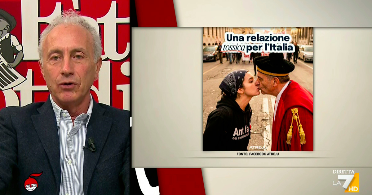 “Se sono ridotti a pubblicare una foto del genere, significa che sono davvero disperati. Forse hanno sondaggi che danno il No ancora più avanti rispetto a quelli ufficiali, perché altrimenti nessuno scenderebbe a queste miserie. Dovrebbero vergognarsi“. Così a Dimartedì, su La7, il direttore del Fatto Quotidiano Marco Travaglio commenta il fotomontaggio diffuso sui social dall’account ufficiale di Atreju in vista del referendum costituzionale sulla separazione delle carriere dei magistrati, in programma il 22 e 23 marzo. L’immagine ritrae un magistrato in toga mentre bacia una manifestante, accompagnata dalla didascalia: “Una relazione tossica per l’Italia”.