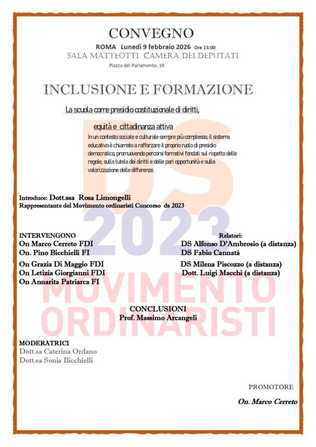 Il 29 gennaio scorso vengo invitato con un messaggio via WhatsApp da Ornella Giulivo, portavoce di un neonato Movimento per la scuola, a un convegno, che si sarebbe dovuto tenere presso la Sala Matteotti della Camera dei Deputati, dal titolo “Inclusione e formazione. La scuola come presidio costituzionale di diritti, equità e cittadinanza attiva” (9 febbraio), temi a me particolarmente cari sia sotto il profilo dell’impegno scientifico sia nelle sue ricadute didattiche, perché potessi tirare le fila sugli interventi previsti. Il convegno era stato organizzato da Marco Cerreto, deputato di Fratelli d’Italia, e prevedeva la partecipazione, oltreché di vari addetti ai lavori, di altri esponenti parlamentari dell’attuale maggioranza di governo: Pino Bicchielli (Forza Italia), Grazia Di Maggio (Fratelli d’Italia), Letizia Giorgianni (Fratelli d’Italia), Annarita Patriarca (Forza Italia).