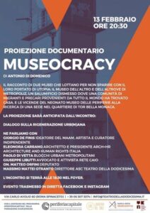 In questi giorni, al Teatro della Dodicesima, la proiezione di Museocracy, di Antonio Di Domenico e Giorgio de Finis, apre un confronto che va oltre il cinema: cosa intendiamo davvero per rigenerazione urbana? Quale modello di città vogliamo? Il film racconta esperienze dal Maam al Museo delle Periferie, spostando il fuoco: non si tratta solo di edifici, ma di diritti, riconoscimento e possibilità di restare — avere un indirizzo stabile, una casa, un futuro non revocabile.