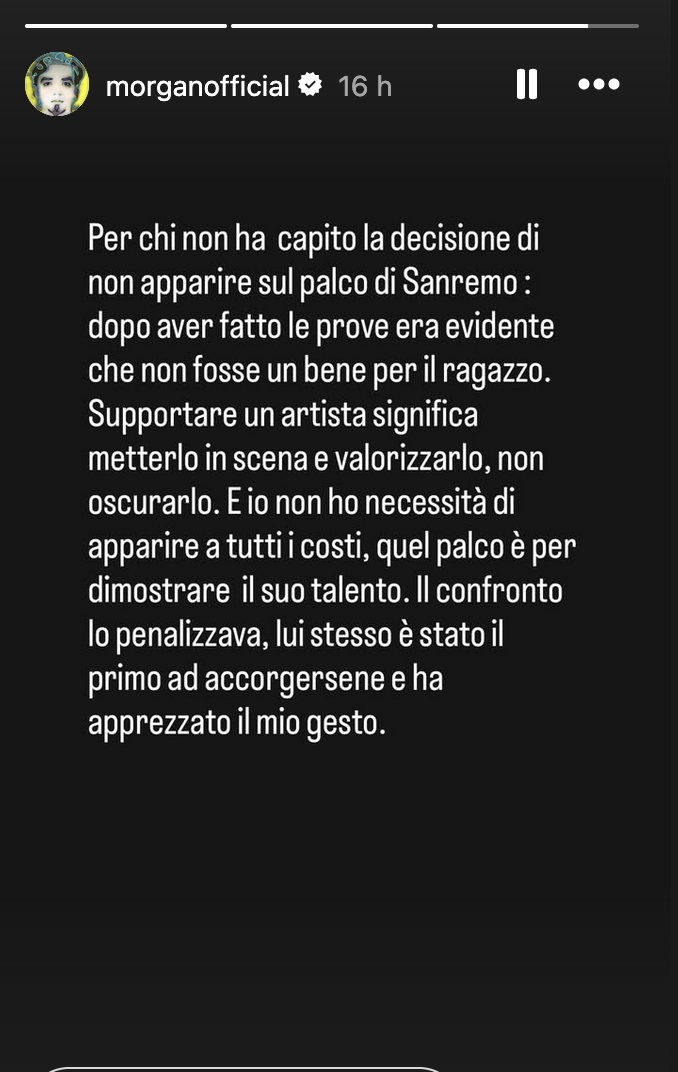 Un “giallo” che sui social ha lasciato spazio a diverse interpretazioni, al punto che poco dopo lo stesso Morgan ha fatto una story tornando sulla questione approfondendola: “Per chi non ha capito la decisione di non apparire sul palco di Sanremo: dopo aver fatto le prove era evidente che non fosse un bene per il ragazzo. Supportare un artistia significa metterlo in scena e valorizzarlo, non oscurarlo. E io non ho necessità di apparire a tutti i costi, quel palco è per dimostrare il suo talento. Il confronto lo penalizzava, lui stesso è stato il primo ad accorgersene e ha apprezzato il mio gesto”.
