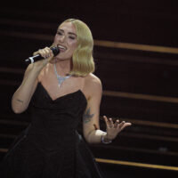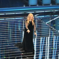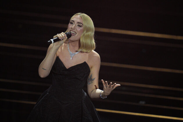 Per la sua prima discesa dalla scalinata Laura sceglie un’abito di velluto nero di Giorgio Armani: l’aveva detto, per il debutto nelle vesti di co-conduttrice ci teneva ad omaggiare Re Giorgio, lo stilista scomparso lo scorso settembre che fu tra i primi a credere in lei e a volerla vestire ad inizio carriera. L’abito a sirena con scollo a barchetta è meraviglioso e risalta le sue curve. A completare il look una preziosa parure di Pomellato composta da collana in oro rosa con diamanti e tanzanite con anello coordinato della collezione Nudo. Unica pecca l’hair look: i capelli così dritti non le donano…