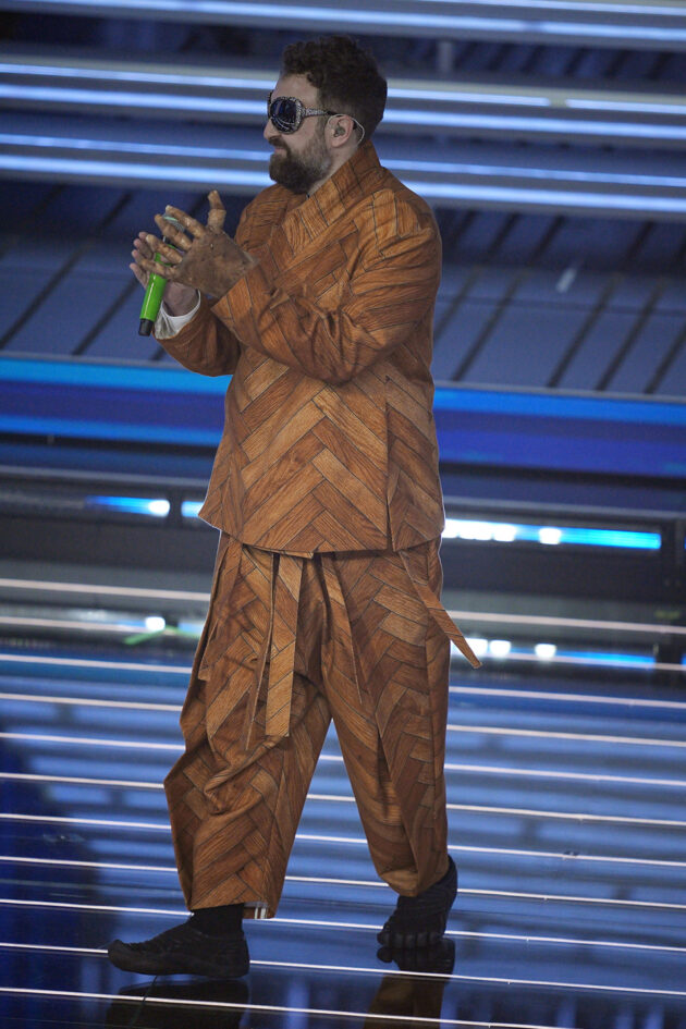 Chi si aspettava il classico “pinguino” in rigido smoking e papillon è rimasto deluso. D’altra parte, ve l’avevamo detto, ha lasciato definitivamente la carrira da avvocato e con essa i completi formali. Il divo turco, attesissimo primo co-conduttore maschile di questa edizione, snobba il protocollo dell’Ariston per restare fedele al proprio copione. Sceglie un abito da sera total black firmato dal designer Ilker Bilgi, portato con i primi bottoni della camicia slacciati per esibire il petto scolpito e l’abbronzatura d’ordinanza. Le battute sul suo fisico sono scontate, ma tant’è: pettorale che vince non si cambia.