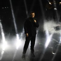 Carlo Conti saluta il pubblico e fa il suo ingresso con il primo look di quest’anno: è uno smoking blu notte con giacca doppiopetto, creata per lui dalle sapienti mani della sartoria di Stefano Ricci.