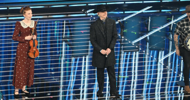 Porta una ballad dai ritmi country e il suo look è perfettamente in linea, con tanto di cravattino. Se il cappello da cowboy non è una novità, il bastone sicuramente sì: l’effetto scenico è garantito.