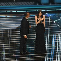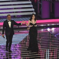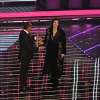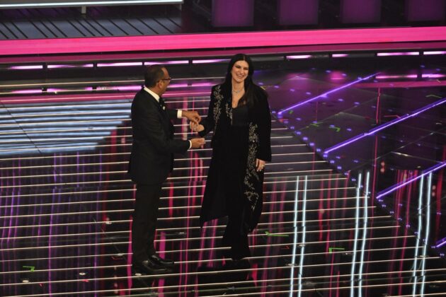 Anche per lei bis in Armani come ieri sera ma va decisamente meglio. Dal rosa siamo passati all’azzurro acquamarina, sempre modello tubino tempestato di paillettes con gonna longuette sotto al ginocchio. L’impatto è sempre un po’ “sciura”, casalinga alla Desperate Housewives, ma, sarà il colore, sarà lo scollo profondo impreziosito da cristalli o forse i capelli raccolti in uno chignon; alla fine il look è riuscito.