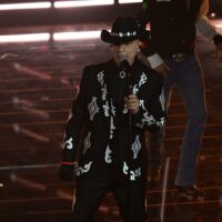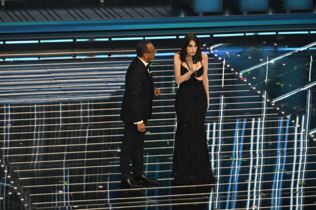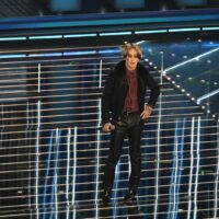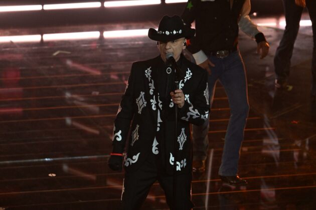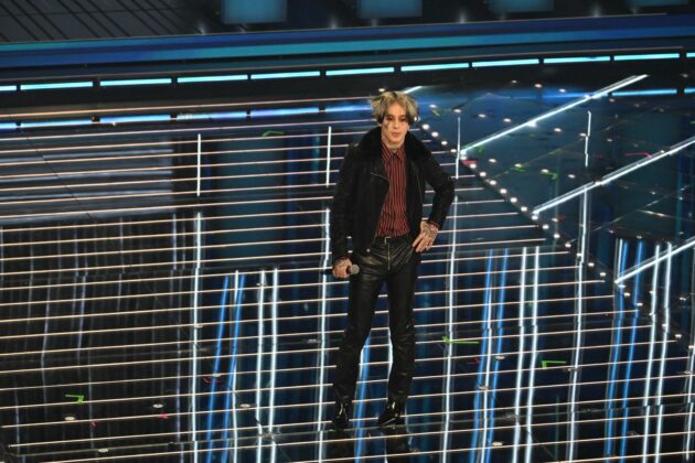 Anche stasera indossa un total look custom Trussardi, sostanzialmente una copia di quello sfoggiato ieri: spolverino in lana chevron, pantaloni in pelle suede con trattamento vintage e camicia a righe sui toni pastello del giallo, rosa e verde che spunta e risalta. Sarà la melodia gitana e fanciullesca della sua “Stella Stellina”, sarà questo look da araldo d’altri tempi, ma se dovessimo immaginare il celebre cantore delle fiabe dei Fratelli Grimm, ecco lo visualizzeremmo proprio così.