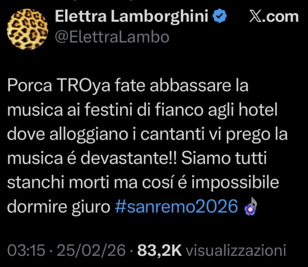 Il Festival di Sanremo 2026 non è solo share, ascolti, palco del Teatro Ariston ma anche una serie infinita di eventi collaterali nel paesino ligure. Feste organizzate di ogni tipo, pronte ad accogliere i cantanti e gli addetti ai lavori una volta spenti i riflettori sulla kermesse. Ma c’è anche chi non apprezza. Come Elettra Lamborghini che, dopo la sua esibizione, è scappata in hotel per riposarsi e fare l’aerosol come da rito. Poi ha voluto condividere uno sfogo su X.