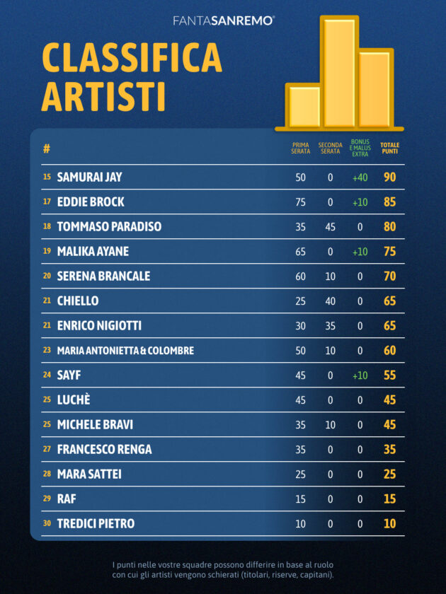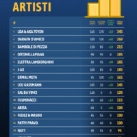 In questa speciale classifica guida Dargen D’Amico con 60 punti, seguito da Elettra Lamborghini, Arisa e Samurai Jay a quota 40. Punti che si sommano a quelli delle serate e che possono fare la differenza nella corsa finale.