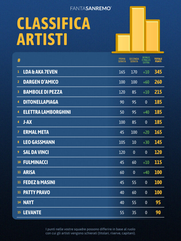 In testa restano saldamente LDA & Aka7even, che non si limitano a difendere il primato: lo rafforzano. Dopo i 165 punti della prima sera, il duo partenopeo ne aggiunge altri 170 con una performance studiata al millimetro in chiave fantasanremese. Il totale sale vertiginosamente e la candidatura alla vittoria finale del fantasy game diventa sempre più concreta.