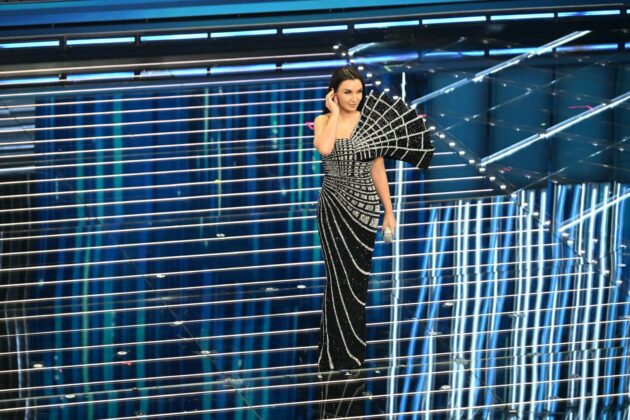 Chiude in bellezza Elettra Lamborghini con un monumentale abito couture di Rahul Mishra con un’architettura che crea come un maxi ventaglio (per non dire ragnatela) sulla spalla sinistra e delinea una scacchiera geometrica sul corpetto con cristalli argentati e paillettes nere. Solo lei poteva. Bacia e abbraccia Carlo Conti e Laura Pausini al grido di “tanto non vinco un tubo, vi saluto ora che non ci rivediamo più”.