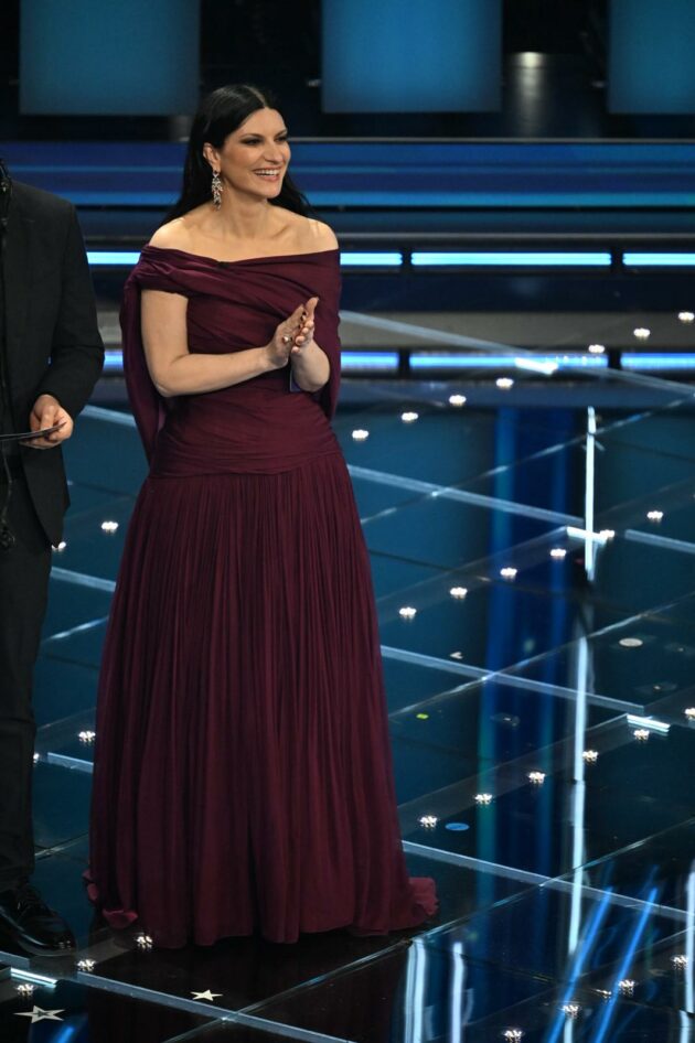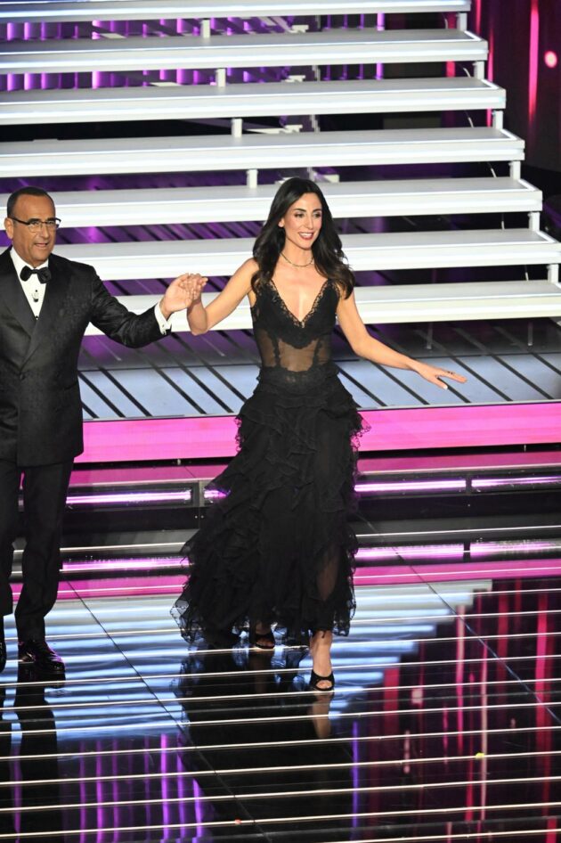 Siamo abituati a vederla a mezzobusto mentre dà le notizie con la rigorosa impostazione del Tg1, ma Giorgia Cardinaletti è perfettamente “nel suo” anche in veste di conduttrice del Festival di Sanremo. A vestirla per l’occasione è Ermanno Scervino, che ha creato per lei un guardaroba sobrio, chic ed estremamente raffinato come è nel suo stile. Il primo abito è un tubino di pizzo rosa nude con riflessi dorati, intessuto di cristalli. Approvatissimo. Alle 23 eccola scendere nuovamente dalla scalinata con il secondo abito, decisamente più sexy. È tutto in seta, con un corpetto lingerie in trasparenza e la gonna a balze. Tradisce un po’ di imbarazzo, ma recupera subito la sicurezza nel momento di annunciare l’esibizione di Ermal Meta.