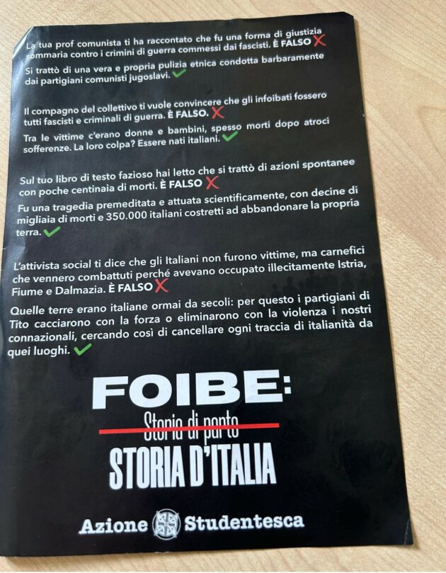 Concludo la tetra carrellata con un volantino, distribuito in moltissime scuole in occasione della recente giornata del Ricordo, che si commenta da sé. Hanno o non hanno motivo i nostri studenti di ribadire un concetto che – purtroppo – ormai tanto scontato non è? “Le pulsioni autoritarie di Valditara ci erano note da tempo – afferma Tommaso Marcon di OSA – ma negli ultimi mesi si è arrivato a un livello repressivo ‘sfacciato‘ contro le stesse formalità democratiche: è difficile anche solo convocare un’assemblea di istituto senza incorrere in divieti, dopo le indicazioni sul contradditorio e la generale torsione repressiva. Anche le libertà democratiche basilari che permettono di organizzarsi nelle scuole fanno paura dopo il movimento del Blocchiamo Tutto di settembre e ottobre, verso cui il Governo ha scagliato un’autentica vendetta. Il 14 marzo saremo in piazza a Roma al No Meloni Day, il corteo per il No Sociale al Referendum e in opposizione al Governo, anche per respingere questa pericolosa spirale e ribadire che senza conflitto non c’è democrazia, se lo mettano in testa”.