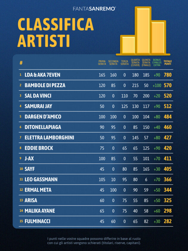 Terza posizione per Sal Da Vinci, trascinato anche dai 100 punti di bonus per la vittoria del Festival. La sua ultima serata vale 200 punti complessivi: standing ovation totale, discesa in platea, accessorio rosso, papillon del direttore, esibizione dopo l’una, gesto delle dita a V e altri bonus che hanno reso il finale ancora più ricco. Il trionfo all’Ariston si è trasformato in un balzo decisivo anche al FantaSanremo.