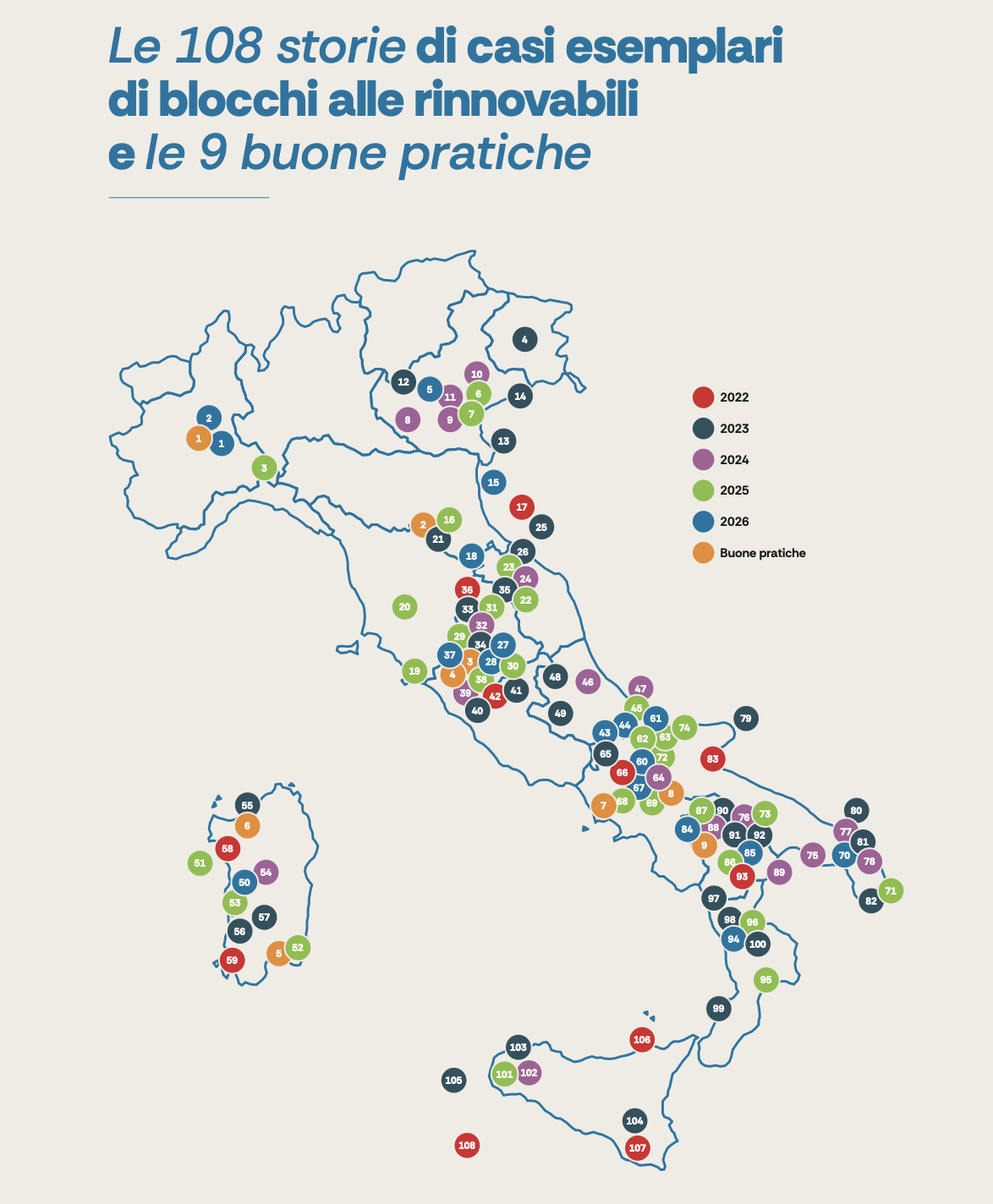 Su 108 storie totali di blocchi alle rinnovabili mappate in questi anni, 18 sono quelle censite nel 2026. A livello regionale la Puglia è la regione con più casi censiti in negativo (14), seguita da Veneto, Umbria, Basilicata e Sardegna. Tra i casi simbolo di quest’anno, c’è un progetto eolico da 23 megawatt proposto su una ex cava e discarica ad Ariano Irpino, in provincia di Avellino, in Campania, bocciato dalla Soprintendenza per la presenza di un vincolo archeologico ignorato durante l’emergenza rifiuti. In Emilia-Romagna, è in stallo l’eolico offshore a largo di Ravenna: un hub rinnovabile integrato da oltre 750 megawatt (eolico, solare galleggiante, accumulo, idrogeno, acquacoltura) con Via positiva e permessi già ottenuti nel 2024, che resta fermo non per mancanza di autorizzazioni, ma per l’assenza di un quadro regolatorio adeguato. In Umbria, invece, il cortocircuito è culturale-amministrativo: a Terni, alcuni cittadini si sono visti negare il fotovoltaico sui tetti perché “non esteticamente gradevole” e addirittura “visibile da un drone o da satellite”. Legambiente chiede al Governo Meloni “un atto di responsabilità in tema di fonti rinnovabili”. Dodici le proposte che avanza all’Esecutivo chiedendo in primis al ministero della Cultura e alla presidenza del Consiglio di accelerare gli iter interni, fissando un termine massimo per le determine nei casi di pareri contrastanti con priorità ai procedimenti più vecchi. Allo stesso tempo, spiega, “è fondamentale snellire gli iter autorizzativi per velocizzare la realizzazione degli impianti a fonti rinnovabili, a partire dalle attività di repowering degli impianti eolici già esistenti”. Legambiente chiede poi di completare l’organico della Commissione Pnrr/Pniec del ministero dell’ambiente e della sicurezza energetica, rafforzando allo stesso tempo il personale tecnico negli uffici regionali e comunali preposti alla valutazione e autorizzazione dei progetti. E di rendere aree di accelerazione quelle già compromesse (come le ex cave o i siti di bonifica), le aree a forte pressione ambientale (come quelle adiacenti a strade, autostrade, ferrovie) e quelle in cui gli impianti sono già presenti.
