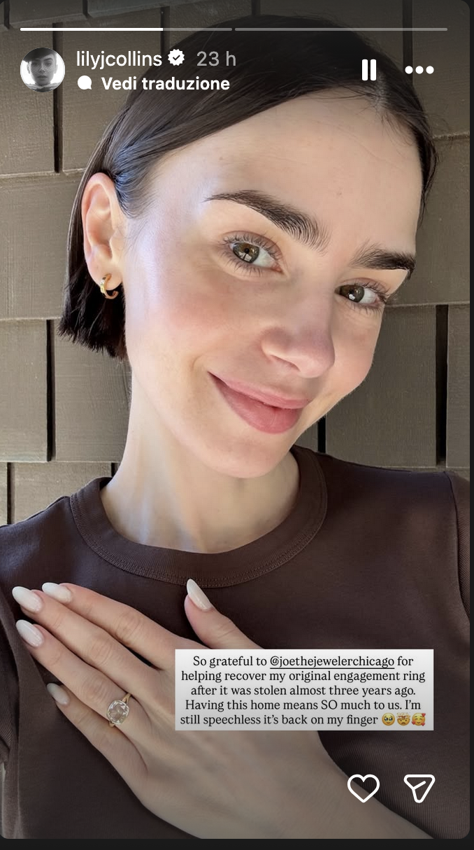 L’anello di fidanzamento di Lily Collins è tornato al dito dell’attrice. Ci è voluto del tempo, nello specifico 3 anni, prima che ciò accadesse. Nelle storie di Instagram la star di “Emily in Paris” si è detta senza parole dopo che la gioielleria Hakimian Imports di Chicago è riuscita a recuperare l’anello con diamante taglio rosa disegnato da Irene Neuwirth che le era stato rubato 3 anni prima. “Avere questo a casa significa molto per noi”, ha scritto in un selfie in cui mostra il prezioso. “Sono ancora senza parole, è di nuovo al mio dito”.