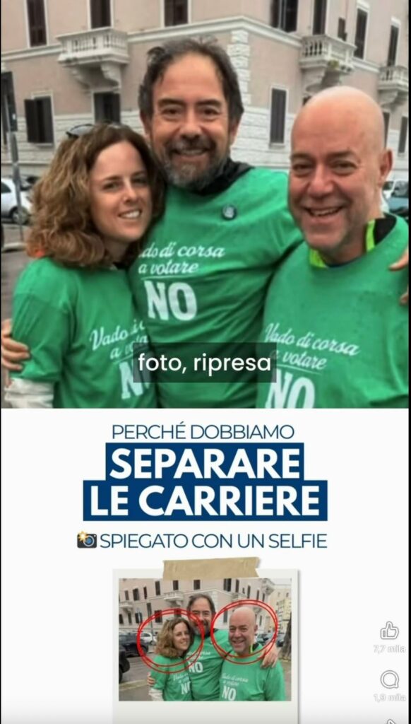 C’è da chiedersi: pubblicità lineare o discutibile? Nella foto non figurano abbracciati la giudice e il procuratore e non si dice che entrambi fanno parte della stessa corrente, cioè Area, il cui segretario è Zaccaro, che sta al centro. Non si dice che i due sono a una manifestazione per il No. Ma c’è di più: un conto è teorizzare genericamente, come fanno tutti gli esponenti del Sì, che le decisioni dei gip sono distorte in quanto il magistrato condivide la stessa carriera del giudice (assunto tutto da dimostrare). Ma nel caso specifico, esistono delle evidenze che dimostrino un comportamento anomalo e compiacente della giudice rispetto alle decisioni del Procuratore? Per concludere: qualora al referendum dovessero vincere i Sì questo comporterà, e magari il Guardasigilli Carlo Nordio lo scriverà in una delle leggi attuative, che un pm e un giudice non potranno mai più partecipare assieme a una manifestazione pubblica? Non potranno neppure andare a cena con i loro colleghi in occasione di un convegno? Se dovessero trovarsi al bar, il famoso bar di cui parlava sempre Berlusconi, il pm o il giudice dovrebbero allontanarsi scoprendo che stanno rischiando, con quell’incontro, di inquinare e pregiudicare le loro decisioni giuridiche? La vita dei magistrati sarebbe un incubo. Dovrebbero stare attenti persino a fare la spesa al supermercato. Se il gip scopre che il vicino di carrello è un pm dovrebbe piantare la spesa lì e tornare a casa. Roba da farci un film candidato all’Oscar della serie Le vite degli altri…