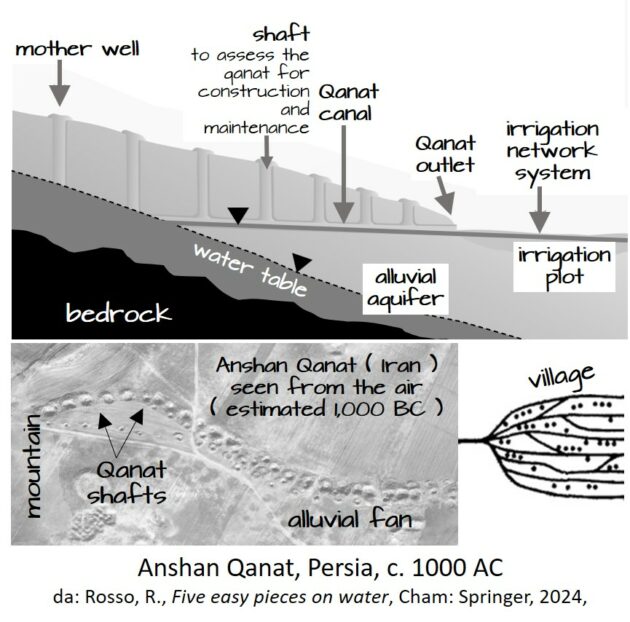 Gli Emirati Arabi Uniti hanno un consumo giornaliero pro capite tra 500 e 550 litri al giorno, più del 90 percento desalinizzata. Il Qatar ne consuma tra 400 e 450, al 99 percento desalinizzata, così come il Kuwait. Nel Bahrein i consumi giornalieri sono un po’ più contenuti, da 350 a 400 litri al giorno, ma la quota derivante dalla desalinizzazione è ancora elevatissima, tra il 90 e il 95 percento. A sua volta, l’Iran è un paese storicamente assetato; ma i suoi consumi non superano i 200 litri al giorno per abitante. La Persia è la culla della moderna ingegneria idraulica, poiché i suoi “qanat” di tremila anni fa hanno indicato all’umanità la via per rifornirsi d’acqua anche in condizioni geograficamente e climaticamente difficili (Fig.1). Tuttora, la quota della desalinizzazione iraniana è inferiore all’uno per cento, poiché le principali fonti sono le acque superficiali e sotterranee.