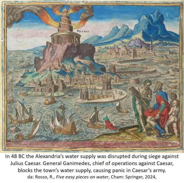 La vulnerabilità dei paesi del Golfo è enorme. In molte città le riserve di acqua dolce non superano 48–72 ore. L’acqua potrebbe diventare un’arma vera e propria, quella che subì Giulio Cesare, assediato ad Alessandria d’Egitto due millenni fa. Il De Bello Alexandrino racconta che i sostenitori di Tolomeo XIII usarono l’acqua come arma strategica, contaminando o danneggiando i pozzi dei Romani (Fig.2). Cesare se la cavò grazie alla genialità militare romana, ma soprattutto grazie all’arrivo delle truppe alleate guidate da Mitridate di Pergamo, che rovesciarono la situazione. Solo così Cesare sconfisse Tolomeo XIII e pose Cleopatra sul trono d’Egitto.