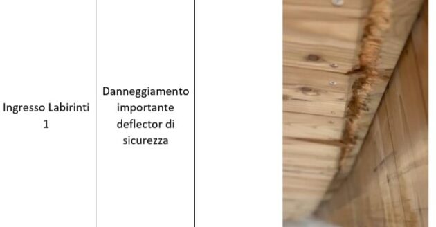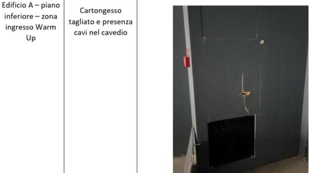 I danni rilevati sono molto diversi. La pulizia è assente un po’ dappertutto. Ovunque si trovano cavi scoperti, staccati o perfino ammucchiati. Reti parapetto sono rovinate o piegate. Danni risultano alle intonacature, segnate o lesionate, ma in qualche caso perfino staccate. Si dovrà accertare se le cause sono stati gli urti o il cedimento degli intonaci. Sono state fotografate porte e uscite di sicurezza danneggiate, compresi il portone di un garage e alcuni maniglioni. Alcuni locali sono stati utilizzati impropriamente come deposito di materiale. Diversi oggetti ingombranti sono stati fotografati vicino alle vie di fuga. In qualche punto degli edifici sono stai tagliati divisori o pannelli in cartongesso. Un danneggiamento grave è stato individuato nei pannelli in legno di sicurezza, sopra la pista ad esempio alla curva Labirinti 1. Qua e là tende rotte o tagliate. Un paio di manometri risultano non funzionanti. Individuato anche il rischio di foratura dei tubi di raffreddamento. Scatole di alimentazione sono state staccate. Qua e là sono caduti pezzi di controsoffitti.