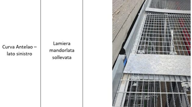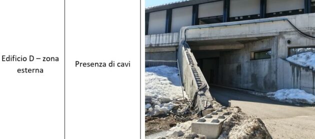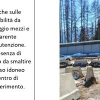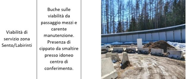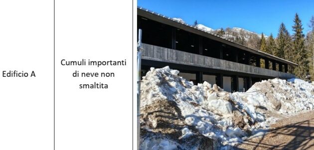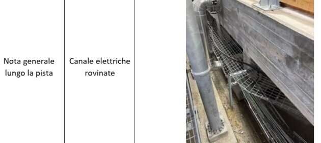 Si aggiunge, all’esterno, “il distacco di gran parte dei dispositivi ferma-neve su entrambe le falde dell’edificio A delle partenze. Si sottolinea che l’attribuzione di responsabilità circa il danno appena riportato è in fase di accertamento”. Nelle stradine è stato stoccato materiale, come in una discarica. Ci sono cumuli di neve non rimossi. Lungo tutta la pista rinvenute scatole schiacciate e canale elettriche piegate, ma sono danneggiati anche dispositivi di sicurezza Safety system. Fotografate buche profonde nella viabilità di passaggio dove lo stato di abbandono è testimoniato anche dal cippato non smaltito.