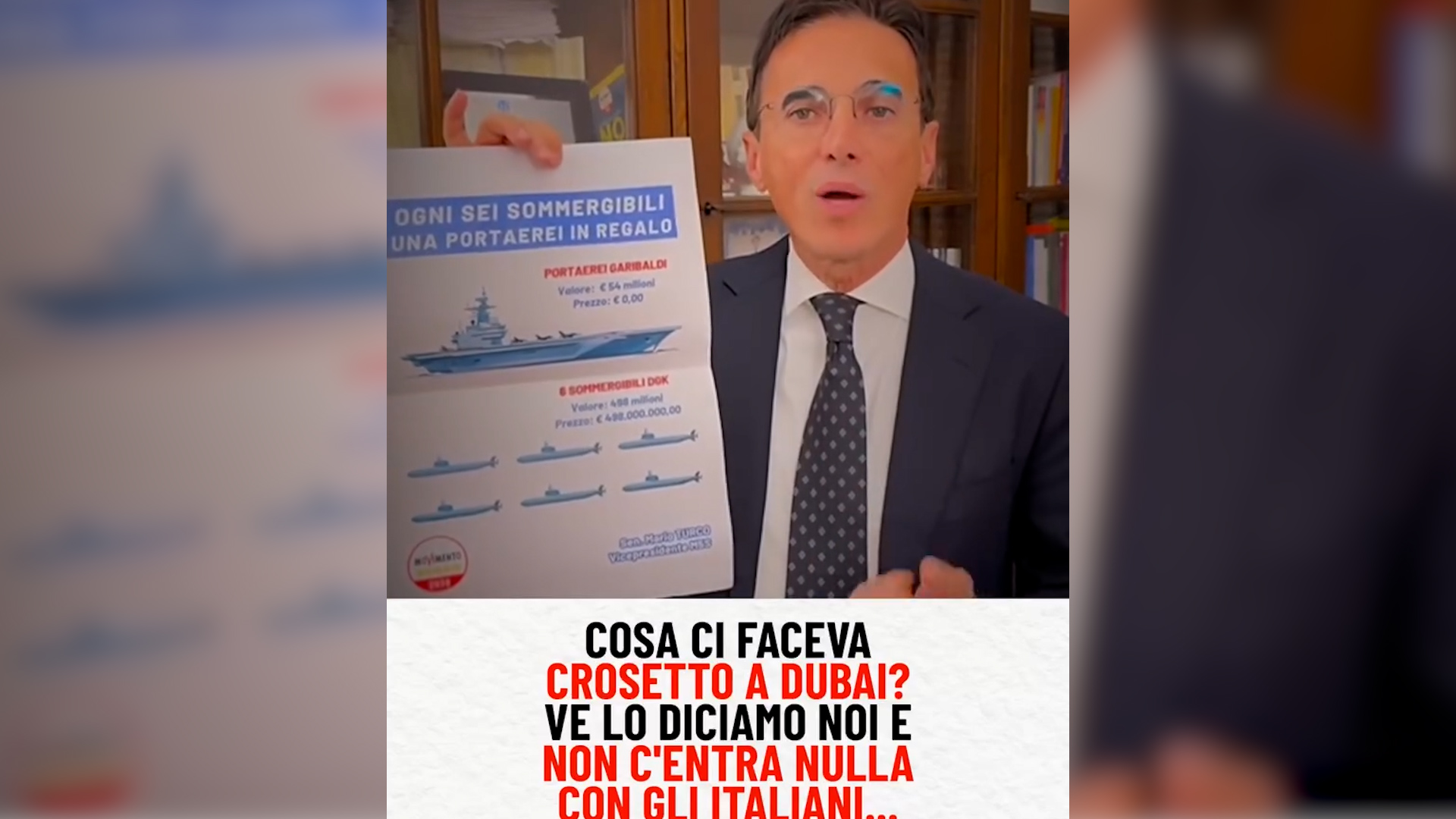 “Vi ricordate la presenza di Crosetto a Dubai? Non era solo in vacanza. Apprendiamo da fonti giornalistiche che in quei giorni c’era il socio e presidente della Drass spa e sappiamo da fonti giornalistiche dell’esistenza di una lettera d’intenti tra il governo italiano e quello indonesiano per una doppia operazione – spiega il parlamentare – Da una parte il governo italiano cede gratuitamente la nave Garibaldi, dal valore di 54 milione, e dall’altra parte si parla di una compensazione con una commessa affidata alla Drass spa, vicina al ministro Crosetto e che scopriamo ha finanziato la campagna elettorale di Fratelli d’Italia”.