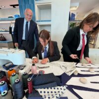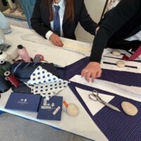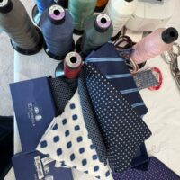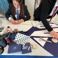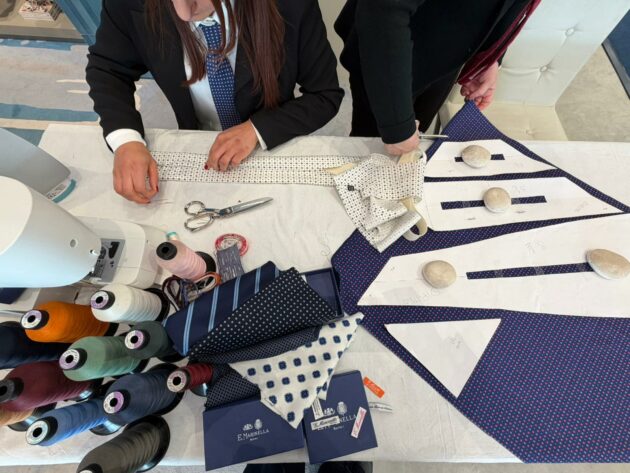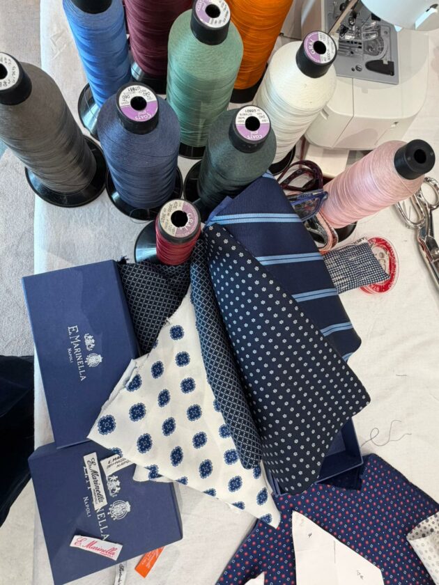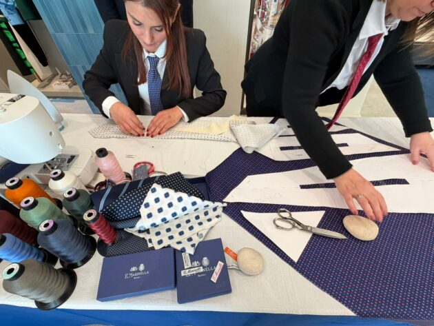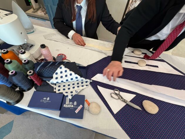 Per questo vedere le sue sarte lavorare “in diretta” a Cortina, tra neve e motori d’epoca, non è una semplice operazione di immagine: è uno spostamento simbolico, geografico e culturale. Le loro sapienti mani lavorano la seta in pubblico, seguendo una sequenza che non concede variazioni: taglio, piega, cucitura, controllo della tensione. Ogni passaggio è necessario, nessuno è visibile nel prodotto finito. È proprio questa invisibilità a definire la qualità. Accanto a loro, Maurizio Marinella accompagna il racconto senza trasformarlo in narrazione celebrativa. Piuttosto, lo riporta alla sua funzione: spiegare perché un oggetto così semplice continui a esistere. E perché, nonostante tutto, non sia mai diventato obsoleto.