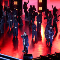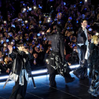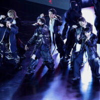 Il concerto si è aperto con i membri dei BTS che si dirigevano verso il palco percorrendo la storica “Via del Re”, un sentiero cerimoniale all’interno del Palazzo Gyeongbokgung tradizionalmente riservato ai re durante la dinastia Joseon. Ogni membro ha optato per un look monocromatico in bianco e nero composto da top fluidi, capispalla strutturati e pantaloni larghi, disegnati da Songzio, uno dei primi marchi di moda indipendenti della Corea del Sud.