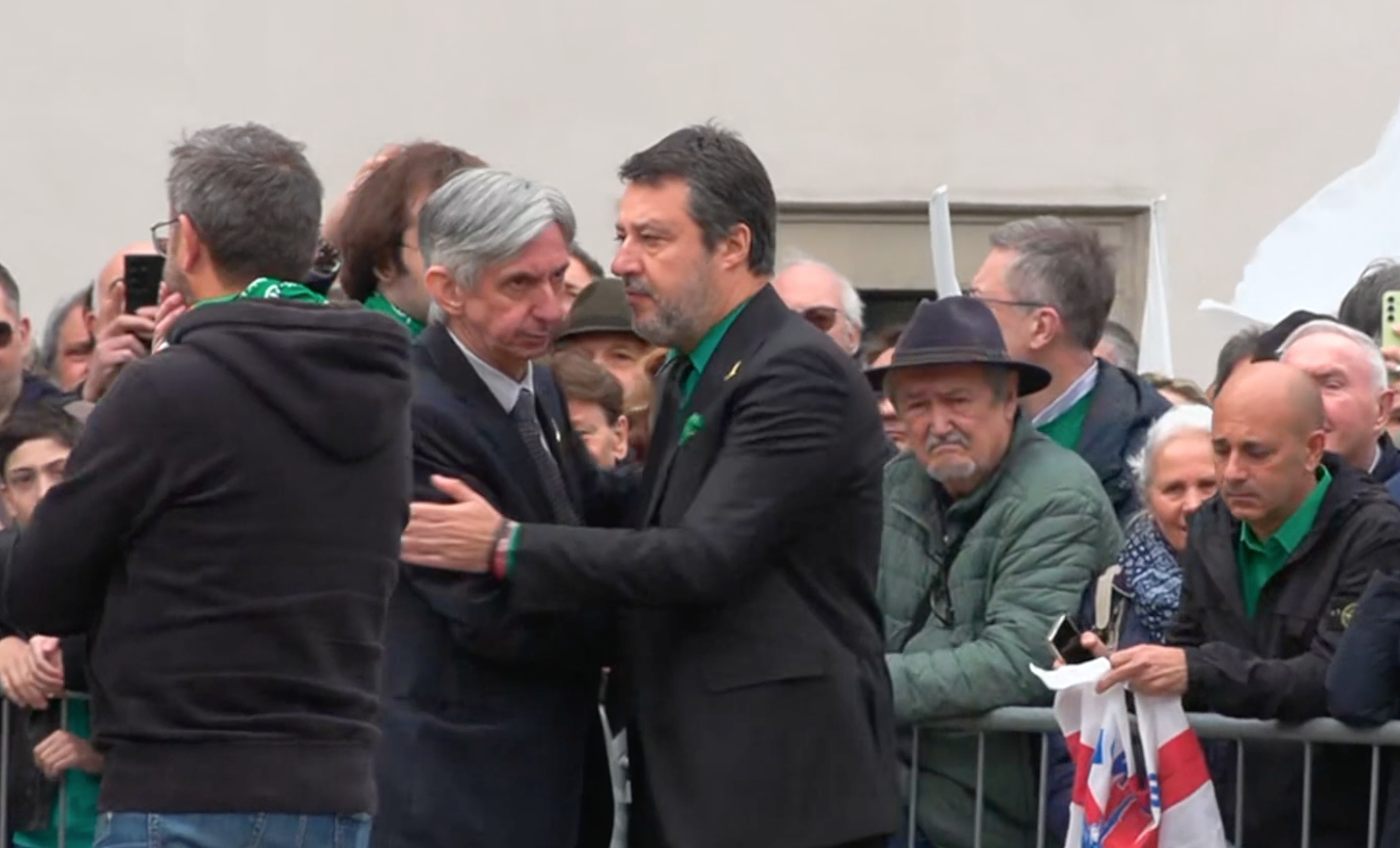 Funerali di Umberto Bossi, Salvini si presenta con la camicia verde e viene contestato: “Mollala”. Applausi per Zaia e Meloni