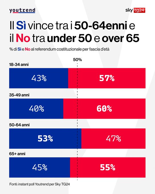 La rilevazione di Opinio certifica il peso del voto giovanile e la spaccatura generazionale: No al 61,1% tra gli Under 35 e Sì al 50,7% tra chi ha più di 55 anni. Una tendenza confermata anche dall’istant pool di Youtrend, che sottolinea come il Sì arrivi addirittura al 53% nella fascia tra i 50-64enni. Sotto i 50 anni, però, trionfa il No: al 57% tra gli Under 35, al 60% nella fascia 35-49 anni. “Il popolo ha salvato la Costituzione. Sono felice per il decisivo contributo dei giovani e dei siciliani. C’è ancora speranza di una giustizia davvero uguale per tutti”, ha detto il pm Nino Di Matteo. Un concetto ribadito ancora da Grosso: “Erano anni che non si vedevano così tante persone andare a votare dopo che ci è stato detto che gli italiani avevano perso ogni affezione verso la cosa pubblica”.
