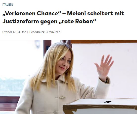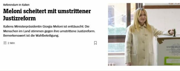 In Germania Der Spiegel parla di “pesante sconfitta” e di una premier “delusa” in quanto la sua “controversa” riforma della giustizia è stata bocciata in un referendum con un’affluenza alle urne “degna di nota”. Die Zeit sottolinea: “I piani di riforma giudiziaria della premier italiana Giorgia Meloni sono falliti“. In Spagna El Pais mette in luce come la vittoria del ‘No’ al referendum sia “la prima sconfitta elettorale in tre anni” di Meloni. Un segnale “di stanchezza senza precedenti in vista delle elezioni generali del 2027″, conclude il giornale spagnolo. Infine, anche El Mundo (area centrodestra) dà rilevanza all’esito del referendum. L’analisi sottolinea come la premier rimarrà al suo posto. Ma la conclusione è sempre la stessa: “Gli italiani hanno scelto di mantenere intatta la Costituzione“.