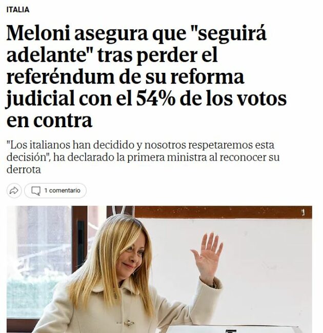 La netta vittoria del ‘No‘ al Referendum costituzionale sulla riforma della Giustizia trova ampio spazio sulla stampa straniera e in particolare sui media europei. La chiave di lettura comune è che la presidente del Consiglio, Giorgia Meloni, esca “indebolita” dall’esito delle urne. Questa è la lettura di Politico Europe, che apre il suo portale online con il commento al voto italiano. “La premier italiana Giorgia Meloni perde il referendum”, è il titolo dell’articolo, che sottolinea come la sconfitta “indebolisce” la posizione politica di Meloni, “soprattutto in vista delle elezioni previste entro la fine del prossimo anno”.