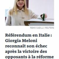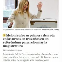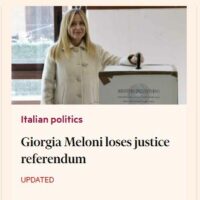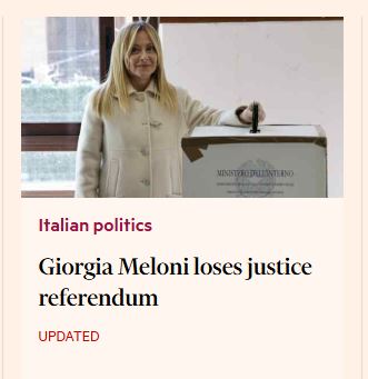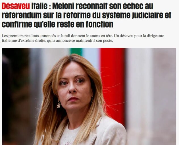 Sulla stessa linea anche il britannico The Guardian, che a sua volta dedica molta rilevanza alla vittoria del No, subito sotto l’apertura sulla guerra in Medioriente. “La sconfitta al referendum rende Meloni più vulnerabile politicamente”, si legge. Mentre sempre da Londra il Financial Times parla di “sonora battuta d’arresto” per la premier e il governo. Anche in Francia è alta l’attenzione per quello che è successo alle urne in Italia. Per il progressista Le Monde il referendum italiano è la seconda notizia di giornata. La lettura è chiara: “Questo fallimento rappresenta comunque un duro colpo per il governo” di Meloni. Analisi condivisa da Libération. Mentre anche il conservatore Le Figaro ammette la “battuta d’arresto” di Meloni.