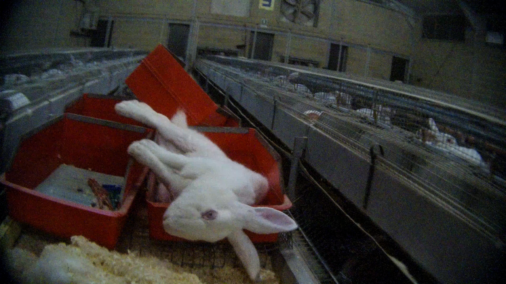 Nell’allevamento vivono in gabbia anche “le fattrici dei conigli, costantemente sottoposte a inseminazione artificiale. Dopo 15 giorni, le coniglie vengono spostate in gabbie dotate di un vassoio di plastica che funge da nido. Alla nascita, i coniglietti vengono suddivisi in base alla taglia, in modo tale che ogni coniglia allatti animali di dimensioni simili, ma non necessariamente i propri. Già 11 giorni dal parto, mentre stanno ancora allattando, le femmine vengono nuovamente fecondate per mantenere alta la produttività dell’allevamento. Dopo due cicli di fecondazione consecutivi che falliscono, una coniglia viene considerata improduttiva quindi scartata e mandata al macello“.